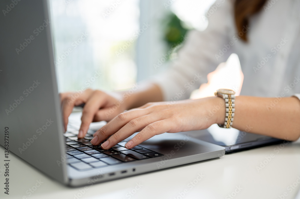 Close up of a businesswoman or female office worker hands typing on her laptop at working desk.