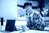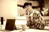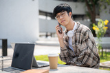 An asian man with glasses is making a call while sitting with laptop at concrete table in park.