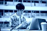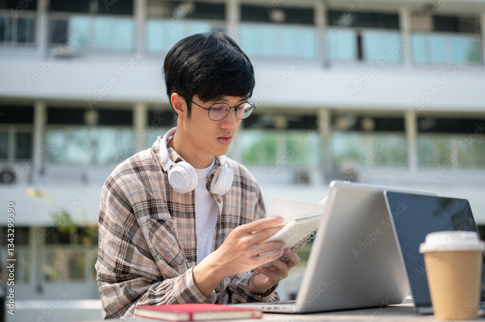 An asian man with glasses is reading a notebook while sitting with a laptop at table in park.