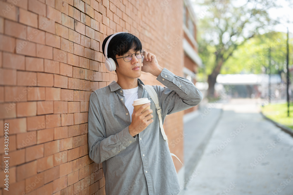 A smiling asian man with glasses is listening to music in his headphones holding a coffee cup while standing leaning on a brick wall.