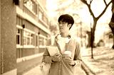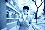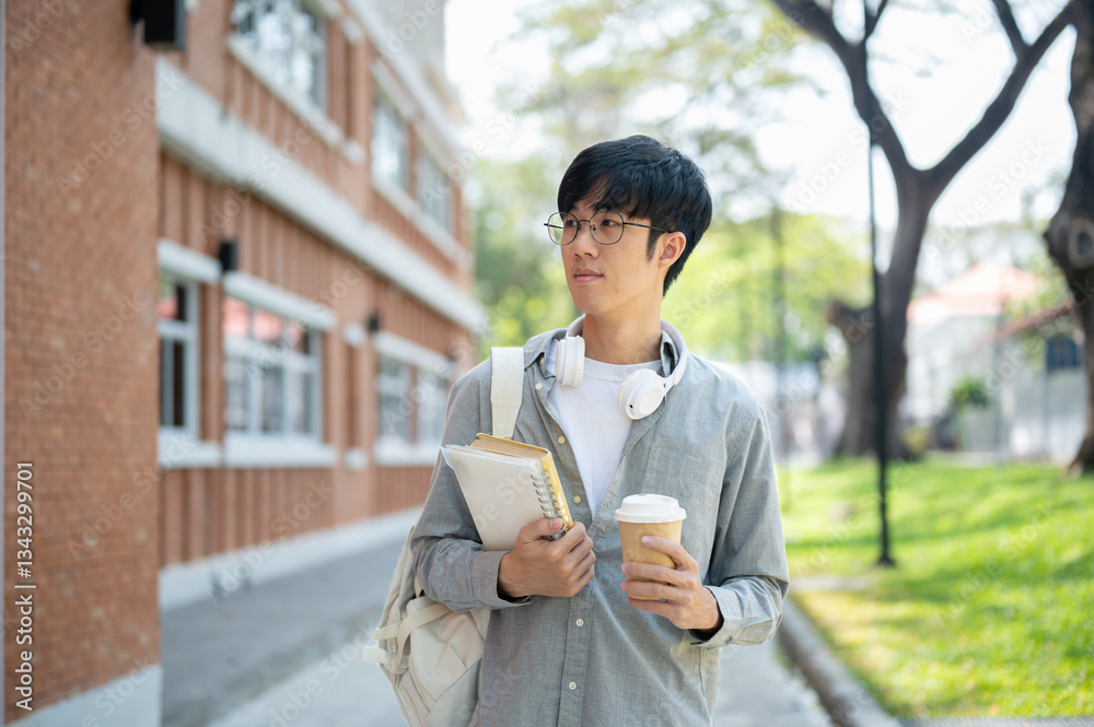 An asian man with glasses is holding books with a coffee cup while standing next to a brick wall.