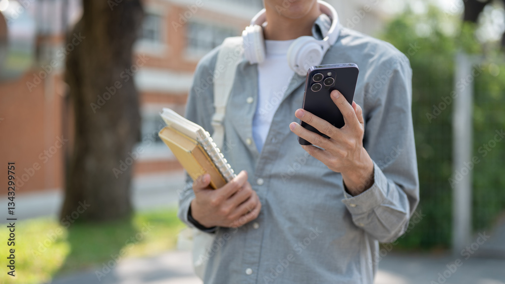 Close up of man looking at smartphone in left hand and books in right hand standing on street.