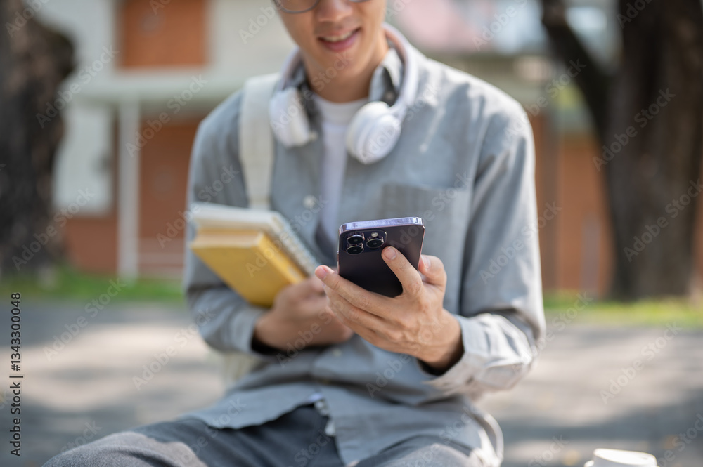 Close up of an asian man with glasses smiling while looking at his phone, sitting on sidewalk bench.