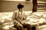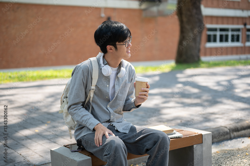 An asian man with glasses is looking away while holding a coffee cup, sitting on the sidewalk bench.