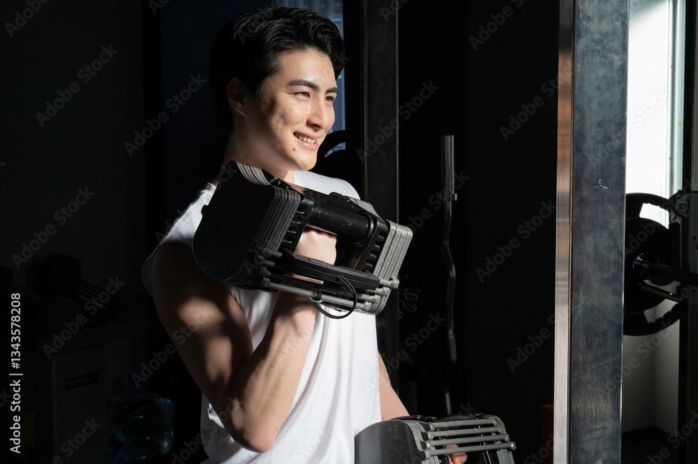 笑顔でダンベルで筋トレをする日本人男性