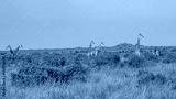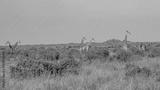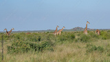 Żyrafa (camelopaurdalis) stado spacerujące pomiędzy drzewami i krzewami na sawannie, Park Narodowy Tsavo i rezerwat wzgórz Taita, Kenia, Afryka