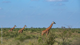 Żyrafa (camelopaurdalis) stado spacerujące pomiędzy drzewami i krzewami na sawannie, Park Narodowy Tsavo i rezerwat wzgórz Taita, Kenia