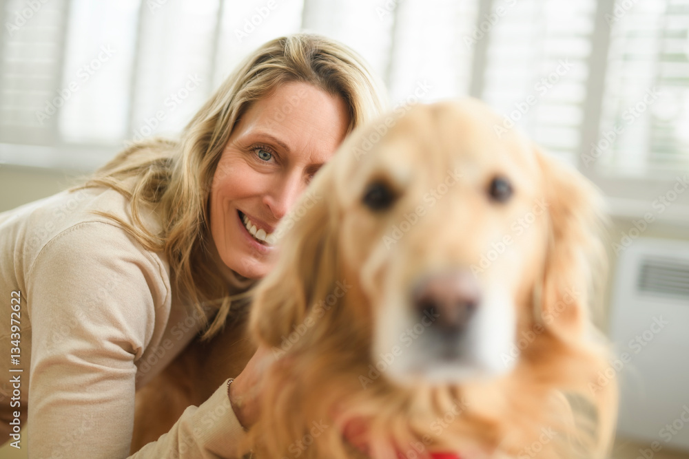 Portrait of woman with healthy golden retriever dog indoors in at home.