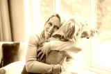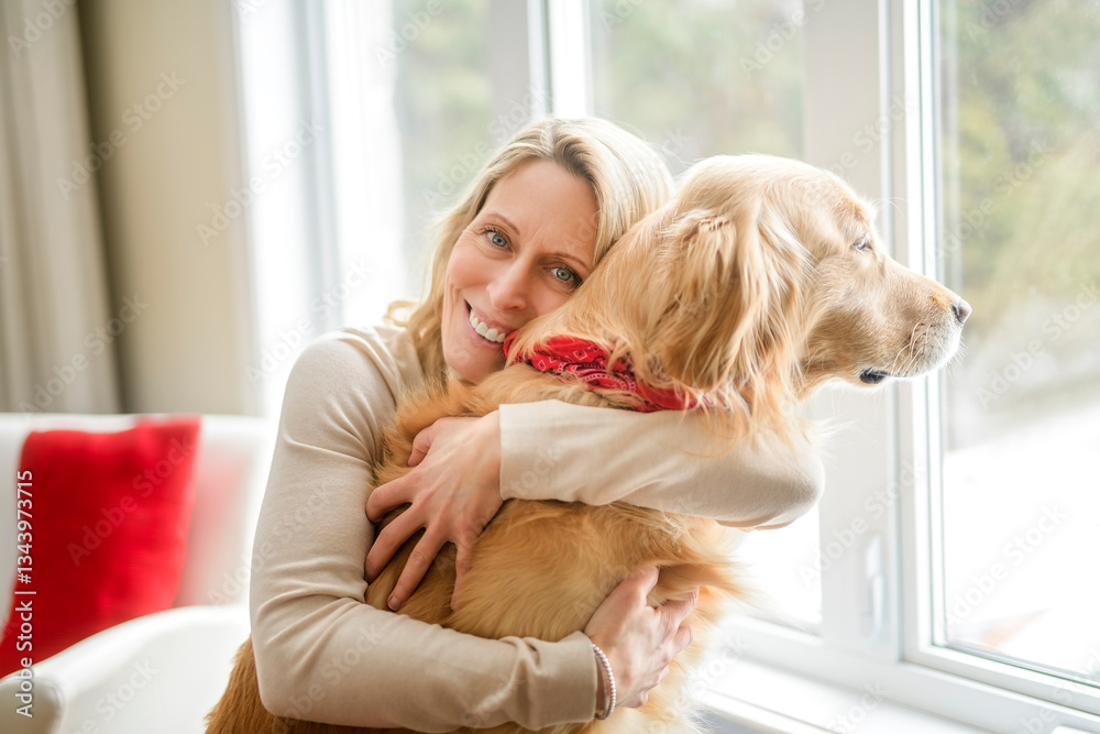Portrait of woman with healthy golden retriever dog indoors in at home.