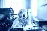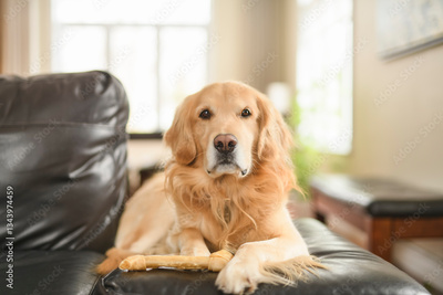 Portrait of happy healthy dog indoors in living room at home. Cute golden retriever