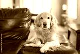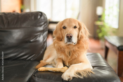 Portrait of happy healthy dog indoors in living room at home. Cute golden retriever
