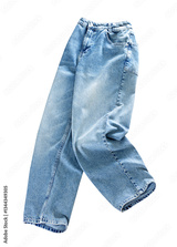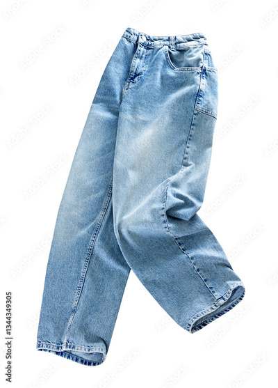 Fashion light blue jeans isolated on white, trendy wide leg loose relaxed design,object,nobody. Denim pants cutout.