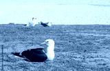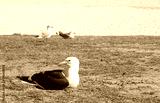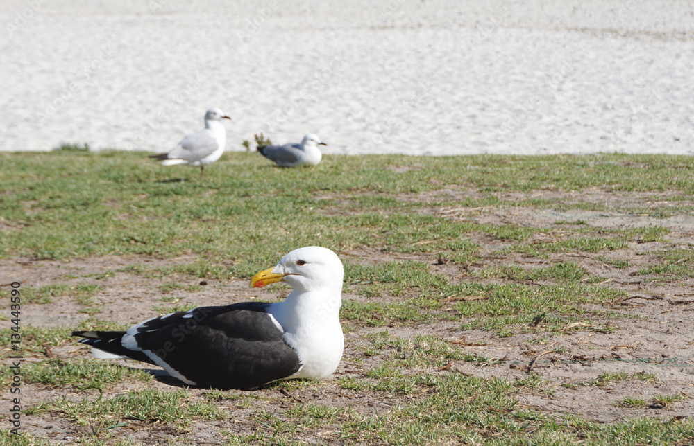 Seagull laying down on the grass with sand background
