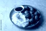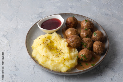 Köttbullar - Traditional Swedish meatballs with cream sauce, mashed potatoes, pickled cucumber, and lingonberry jam