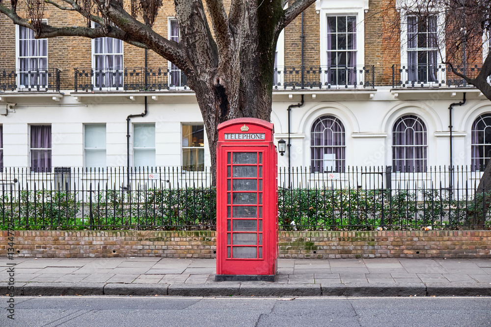 Iconic red London phone booth in front of a block of residential building and a big tree in the Paddington area