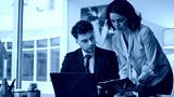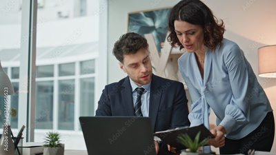 Serious businesspeople discussing report in office closeup. Man displeased work