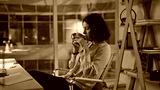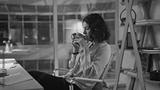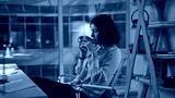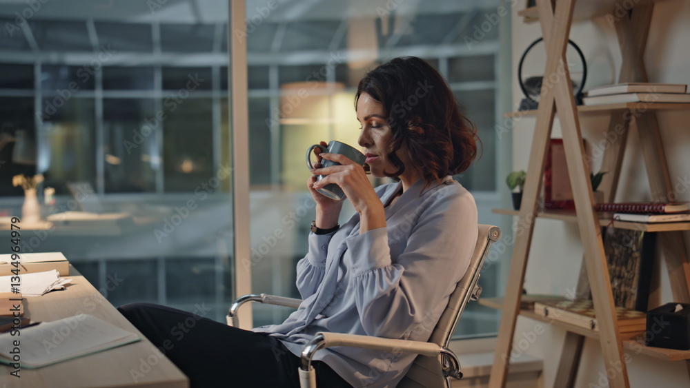 Thoughtful manager sipping tea sitting at office desk at night. Woman drinking