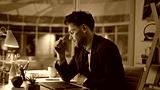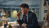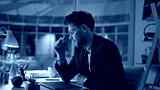 Unmotivated worker looking cellphone checking time at office workplace closeup.