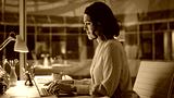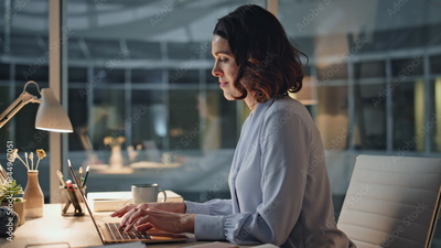 Smiling secretary typing report at laptop at evening office desk closeup.