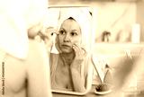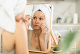 Calm middle-aged woman examining her facial skin looking in the mirror put on the table in her kitchen