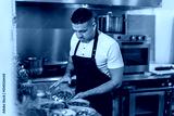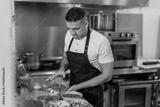 A chef wearing a black apron prepares and seals eco-friendly takeaway bowls with freshly cooked meals in a professional kitchen, ready for delivery. Horizontal, copy-space