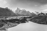 Himalayas. View from Gokyo Ri, 5360 meters up in the Himalaya Mountains of Nepal, snow covered high peaks and lake not far from Everest. Beautiful nature landscape. Travel background.