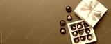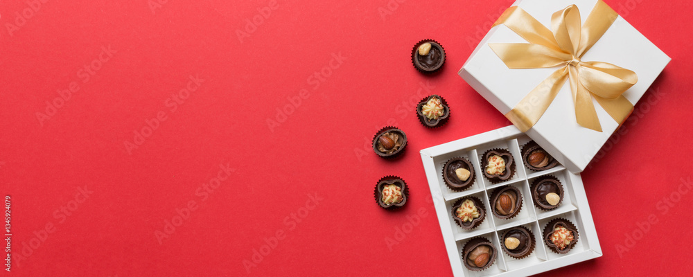 White box with chocolates candies and golden tape. top view with copy space