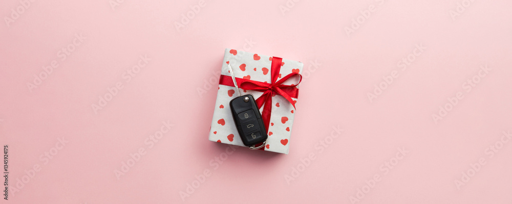 Give gift car key concept top view. Present box with red ribbon bow, heart and car key on pink colored background