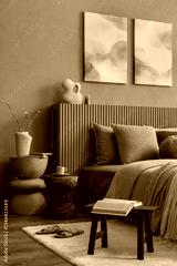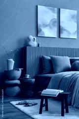 Close-up of a beautifully arranged bedroom with a ribbed blue headboard, decorative pillows, and warm wooden side tables.