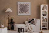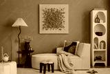 A soothing blend of beige and brown hues shapes this inviting living room. Natural materials, a sculpted wall piece, and layered textiles enhance the space with warmth and texture.