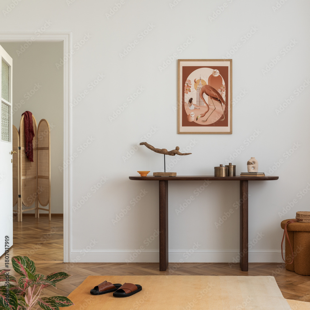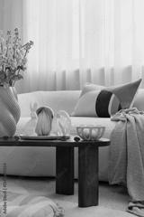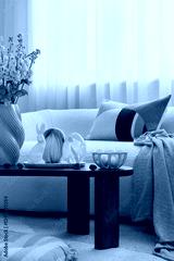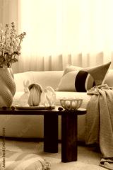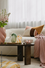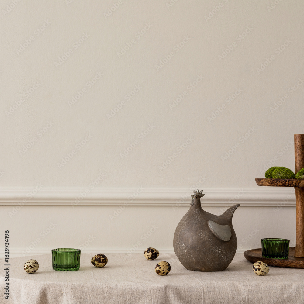 Modern Easter decorations with a touch of rustic charm. Woven bunny figurines, pastel pillows, and natural elements create a cozy holiday vibe.