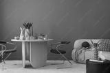 Stylish Easter-themed interior featuring a wooden table with pastel decorations, tulips, and a cozy seating area.