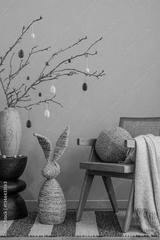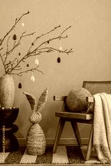 A rustic-inspired Easter arrangement with a woven bunny sculpture, a cozy rattan chair, and a soft neutral-toned throw, creating a harmonious and inviting ambiance.