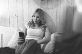 teen doing homework in her bedroom in a house interior with cellphone