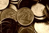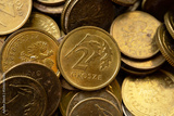2 grosze Polish zloty coin among many other PLN coins, macro close-up of Polish currency, small denomination money, financial concept, metallic coins, gold color, cash economy, savings, numismatics