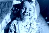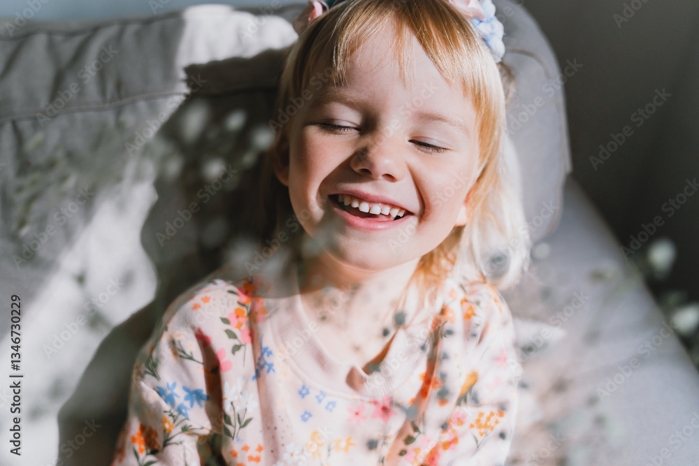 Beautiful little girl smiling and squinting in sunlight. Portrait of dreamy playful child preschool age.