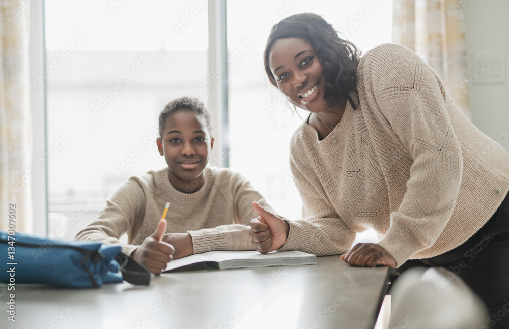 Beautiful woman and her cute little daughter are doing homework