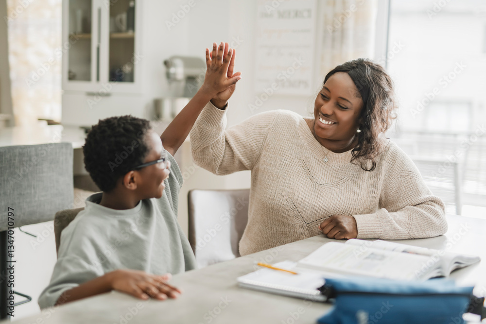 Beautiful woman and her cute little son doing homework and smiling while sitting on kitchen
