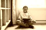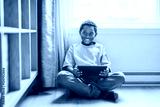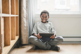 Relaxed american child on the floor livingroom with tablet
