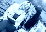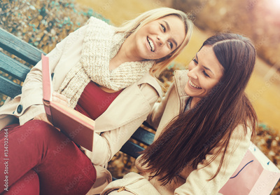 Two young women resting in the park after shopping. Consumerism,