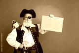 Photo portrait of bearded pirate man hold picture frame wear hallooween costume isolated on blue color background