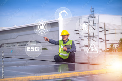 A solar energy engineer inspects photovoltaic panels using digital technology to drive a sustainable future with ESG standards."