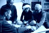 Little girl in Christmas hat playing chess with her relatives during their visit to the ward