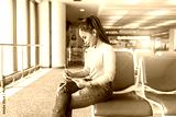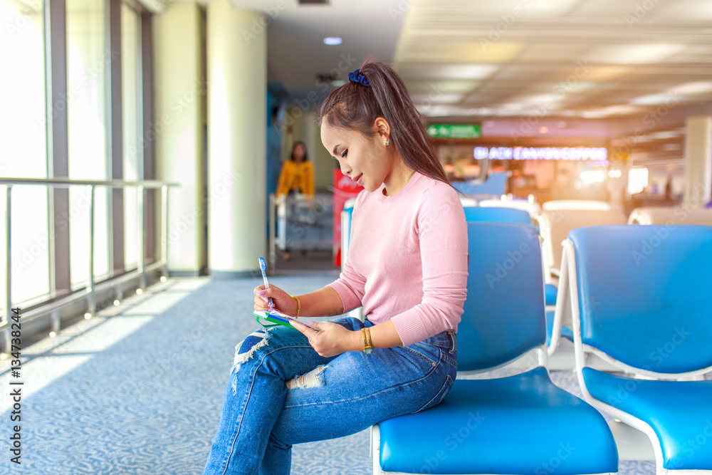 Beautiful young tourist sitting on a chair and writing record travel on notebook in international airport