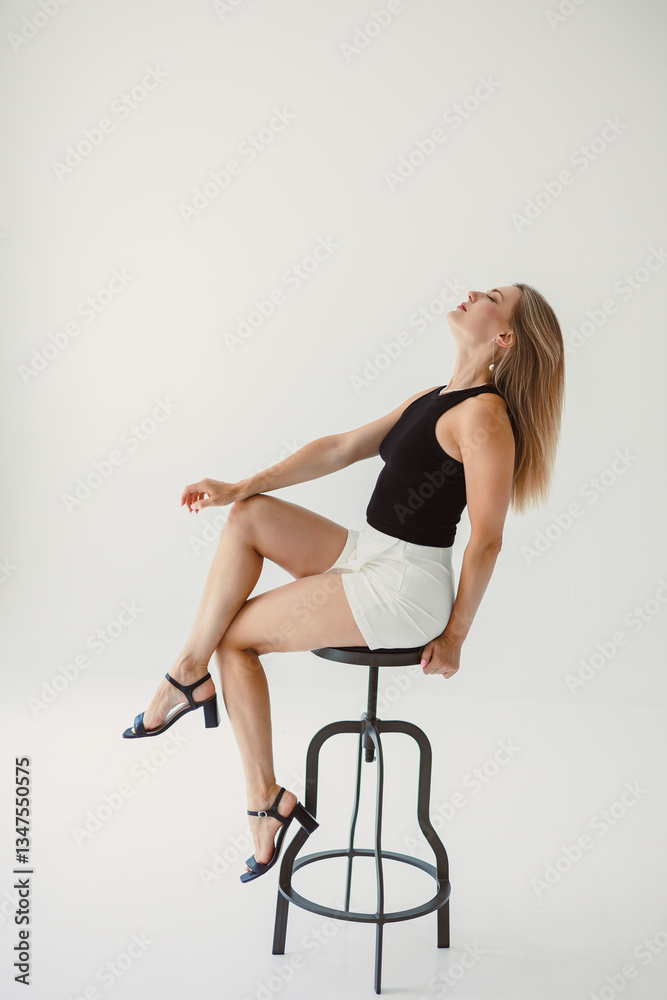 A Stylish Young Woman is Posing Gracefully on a Bar Stool, Set Against a Minimalist Background That Compliments Her Look, Exuding an Air of Confidence and Contemporary Elegance in Every Detail