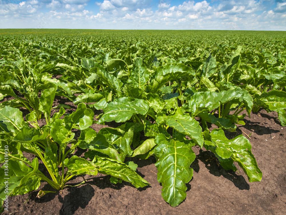 close up of green sugar beet leaves at field under a blue sky with clouds