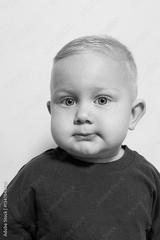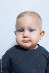 This toddler portrait features a child with bright blue eyes and a stylish haircut, set against a clean background that emphasizes their charming personality and joyful expression