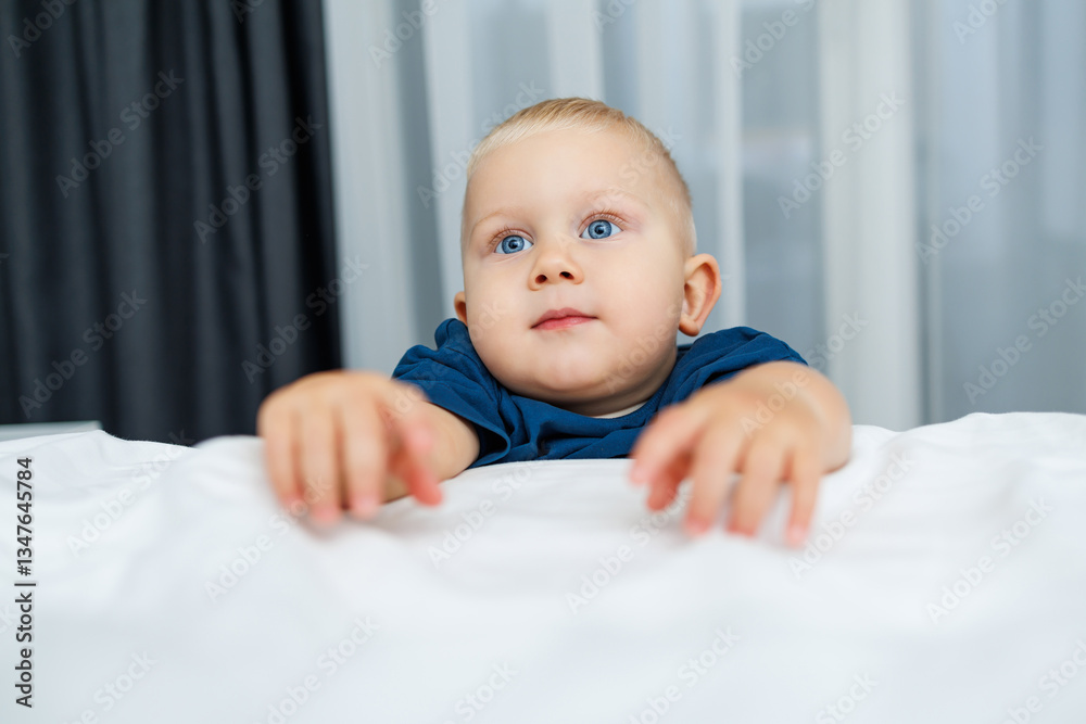 A very charming baby with bright blue eyes happily playing on a soft bed situated in a cozy, comforting room designed for relaxation and joy as they explore their wonderful environment