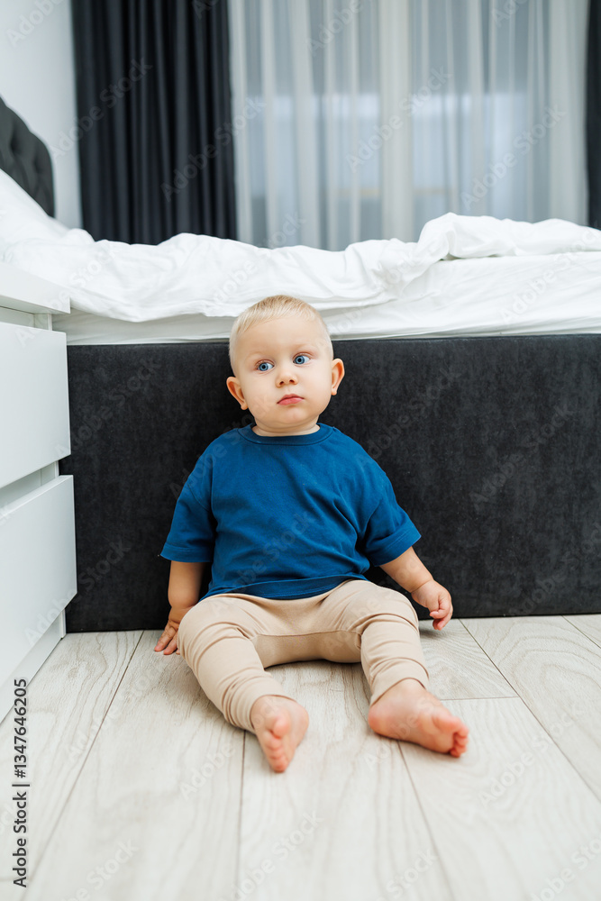 A happy toddler sits on the floor in a cozy room, surrounded by charming furniture, exuding innocence and curiosity while playfully exploring their warm and comfortable surroundings