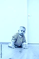 An adorable and cute baby happily crawling on a wooden floor in a beautifully designed minimalist home interior. The bright and inviting space enhances the joy of this playful childhood moment